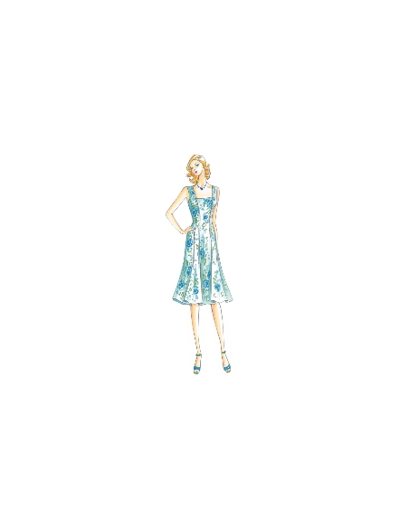 Vestido corto y modelado, la falda se abre en forma de campana hacia la parte inferior. Tela aconsejable raso de algodón o popelina. Se puede realizar también por la pantorrilla.