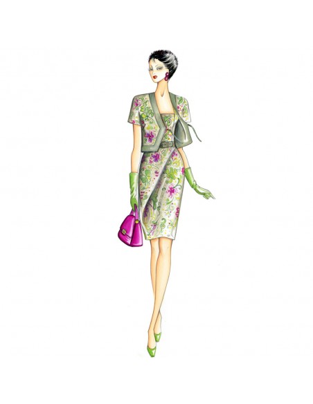 Vestido con top a la americana, posible en dos versiones: con falda recta o con pliegue diagonal que crea un efecto de panel. Se puede hacer en tejido jacquard, organdí, raso duquesa, encaje, seda moaré, faya. Combinable con el bolero 3334.