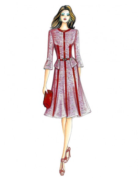 Vestido, recomendado en lana bucle o tejido mezclado, de corpiño ajustado, con mangas por el codo y con volante, talle marcado gracias al pequeño cinturón aplicado y faldellín alto, colocado sobre los flancos, falda dividida en telas acampanadas acabadas en un borde de terciopelo o seda.