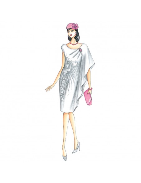 Vestido caftán, asimétrico, en un lado la manga tipo mariposa y en el otro, de tipo kimono, drapeado ligero preso próximo al escote. Para hacer en muselina, satén, gasa o torzal.