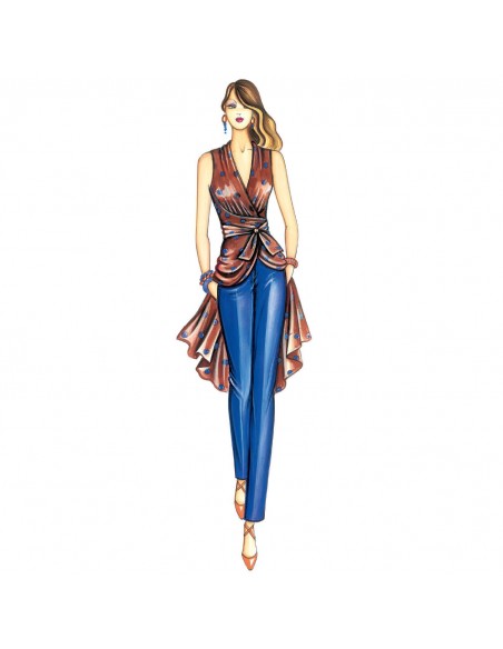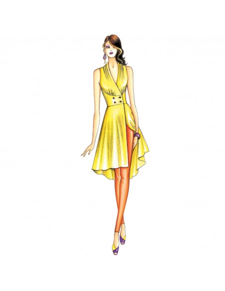 Vestido que se puede hacer en dos variantes: con fajín cruzado por detrás y anudado al talle, o bien con corpiño de doble cruce preso con botones, falda abierta, cruzada y dobladillo bajando por detrás. Se puede hacer también como top y/o falda, separados. Tejidos recomendados: punto o satén.