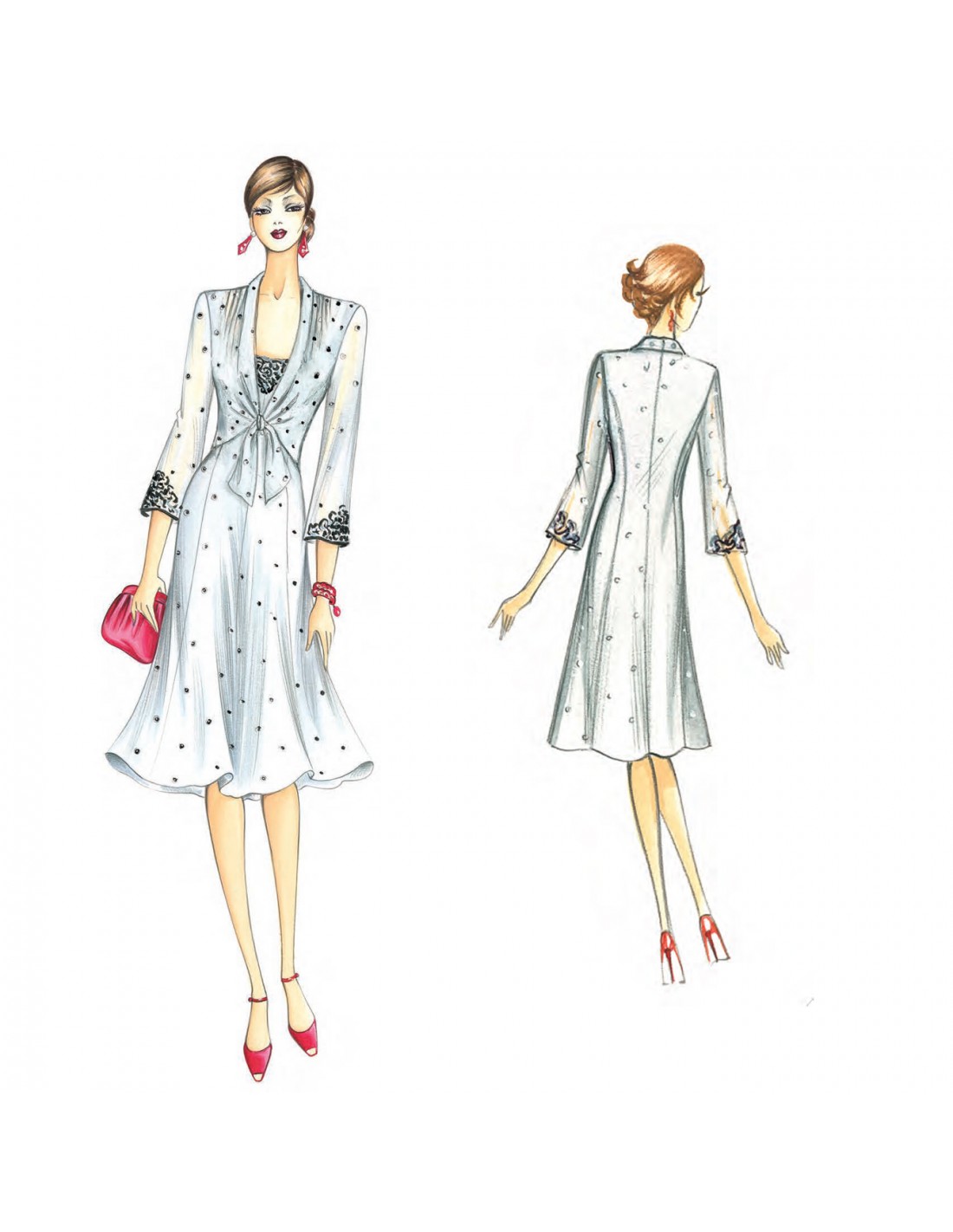 Vestido modelado de paños acampanados en la parte inferior realizable en cady, corpiño escoteado con paneles anudados y drapeados que crean un efecto chal, aconsejados en chifón al igual que las mangas acampanadas.