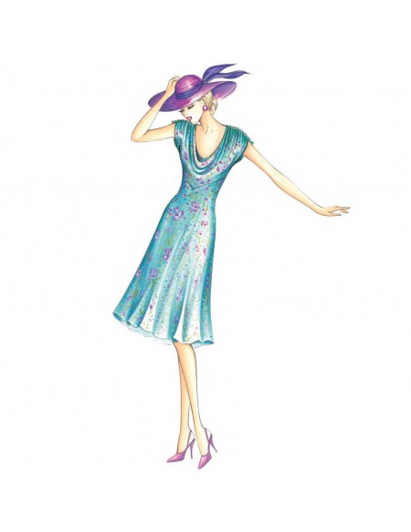 Vestido de corte imperio en V, corpiño con cuello capuchón y corredera en los hombros, falda al bies. Tejidos aconsejados: jersey, satén, crespón de china.