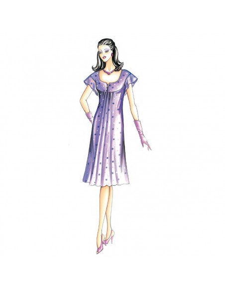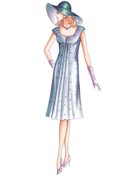 Vestido suelto tipo trapecio, el canesú formando la manga tipo kimono y sujeta el fruncido para dar amplitud a la falda al bies.