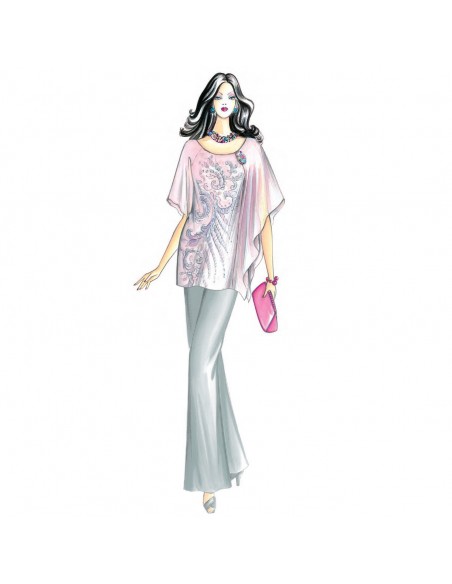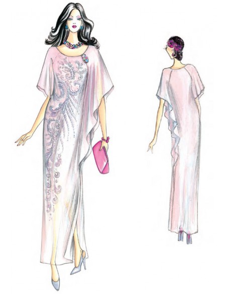 Vestido túnica con manga quimono y soltura con volante de un solo lado.Tejidos aconsejados: chifón, cady, crespón de cina.