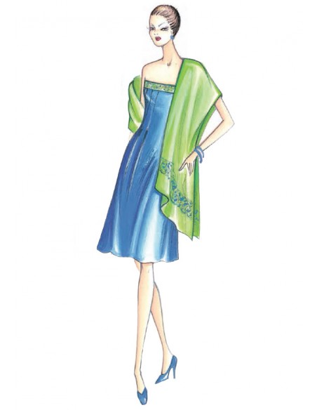 Vestido camisero movido por pliegues sueltos, realizable en satén o seda estampada con mangas en chifón. También realizable en versión escoteada con borde de estrás.