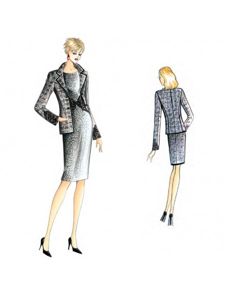 Tejido que se necesita: aproximadamente mt. 1,50 ancho 1,40 – Encaje para el vestido y chaqueta: mt. 0,30 ancho 1,00.