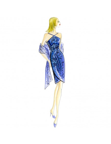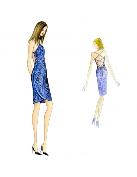 Vestido combinación, escote ancho, parte trasera con tirantes finos y ojales sueltos, fruncido en el lateral y dobladillo redondeado. Se puede hacer en punto, raso suave y lúcido o bien en crepe de chine.