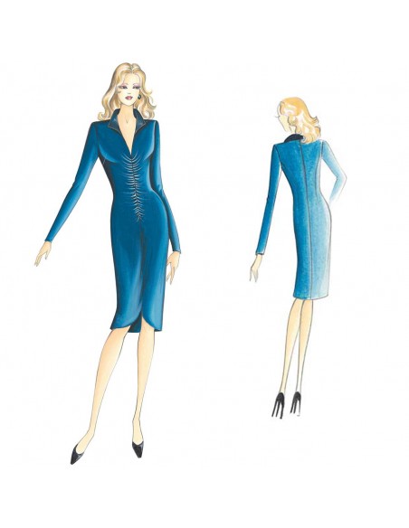 Vestido modelado, se puede hacer en punto o crespón, en la parte central lleva fruncido, dobladillo con abertura redondeada, escote V y cuello de pana.