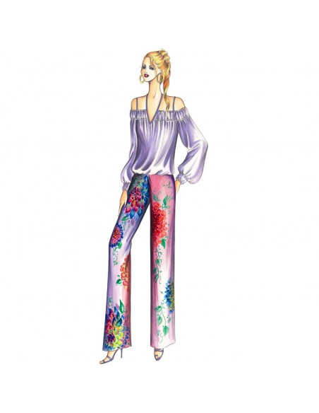 Souple blouse à mi chemin entre la Renaissance et la Rome antique, l’encolure laisse les épaules découvertes avec un double froncis qui suit l’encolure et les poignets, bretelles aussi en V au milieu. Réalisable en jersey ou mousseline de coton. Pantalons n. 3110.