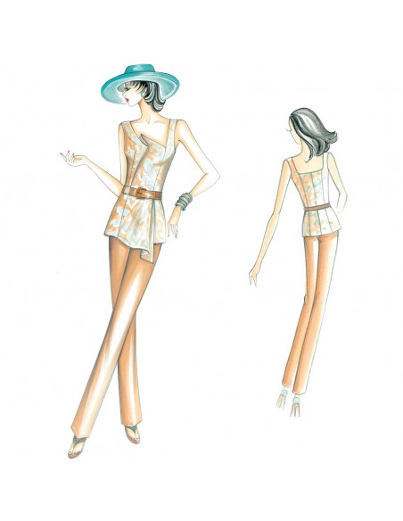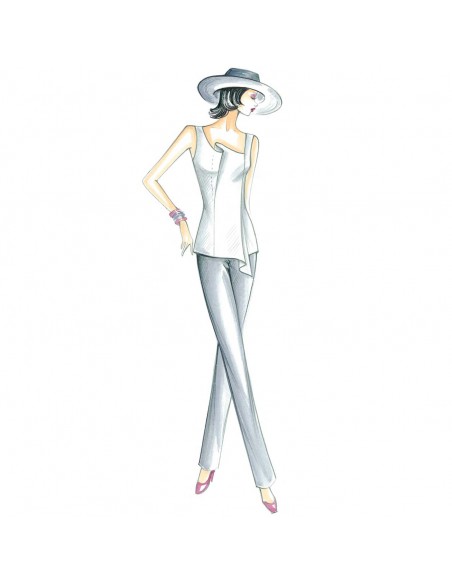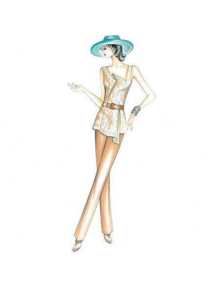 Originale blouse de ligne moulée qui joue avec les géométries, motif de pan rabattu en « vague » sur l’encolure asymétrique et sur le bas. Réalisable en satinette ou lin.