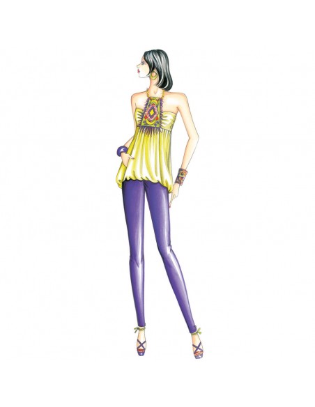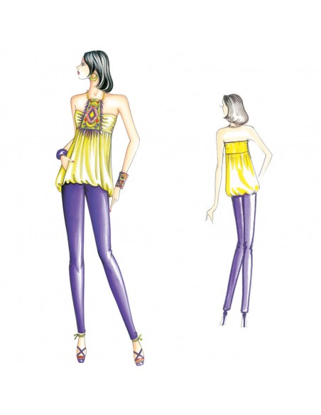 Casaque blousante avec effet poche, broderie ethno-tribale, franges en tissu ou raphia. Tissu conseillé jersey de viscose ou tulle de coton.