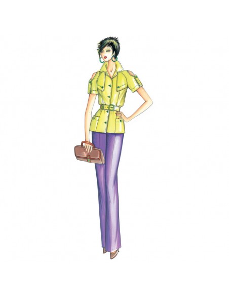Casaque sportive de ligne droite avec ceinture à la taille, manches raglan ouvertes sur les épaules et soulignées par une bande, empiècement soulevé et fixé par un bouton comme les poches. Réalisable en denim léger, batiste, lin.