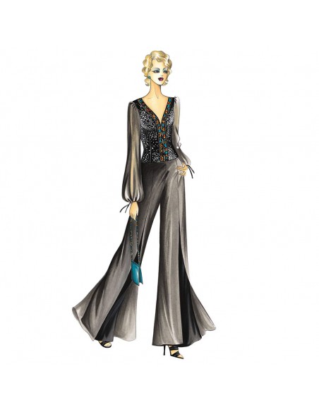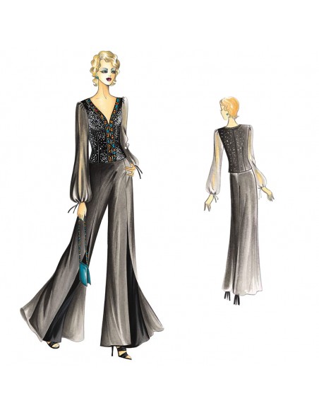 Casaque à réaliser en paillettes ou velours avec bord brodé et perles de couleur, manches en mousseline de soie. Pantalons n. 9728.