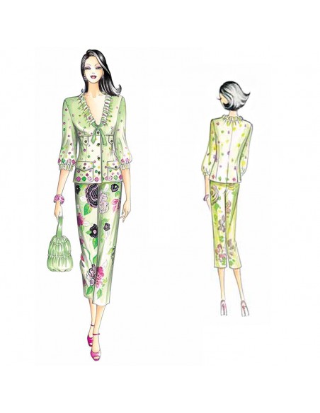 Blouse de ligne moulée avec une coupe empire dans laquelle sont insérées les poches lisérées et des brides, col froncé avec un ruban passant, poches plaquées et manches 3/4 froncées aux poignets. Réalisable en mousseline de soie, jersey, lin, mousseline de coton.