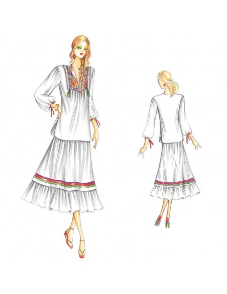 Blouse de style mexicain avec empiècement brodé multicolore et garni par des volants et rubans, manches froncées et épaules légèrement tombantes.