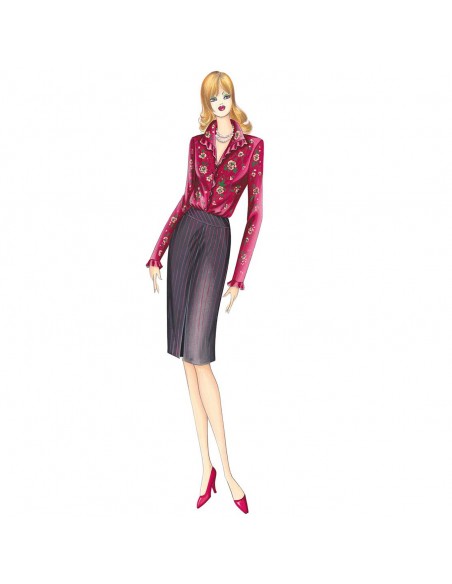 Blouse réalisable en crêpe de chine ou batiste avec ruches sur les poignets et sur le col et qui descendent le long du corsage. Jupe n. 8500.