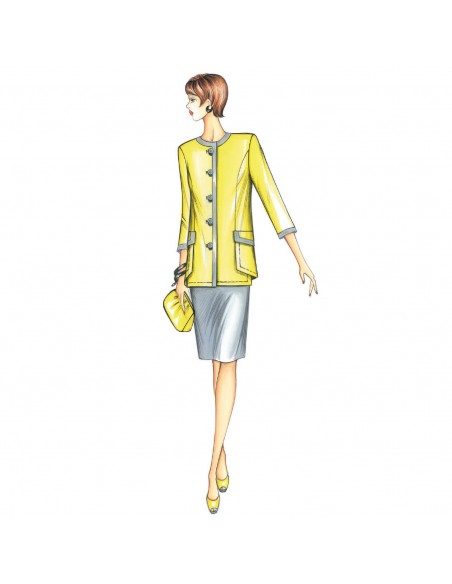 Veste de ligne droite avec pans latéraux géométriques dans lesquels sont insérées les poches, encolure simple et manches ¾. Réalisable en crêpe, faille, bouclé léger, laine douce.