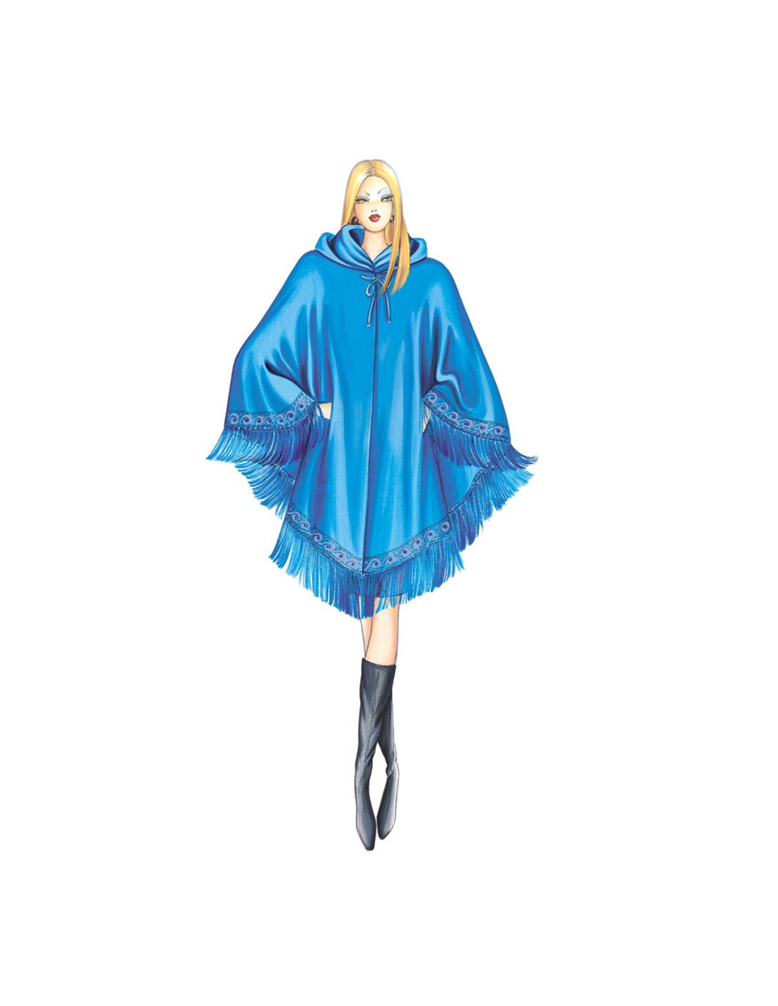 Cape avec capuchon, ourlet bordé et frange de laine.