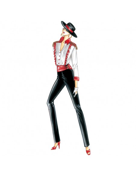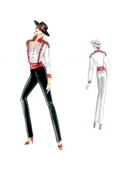 Blouse à réaliser en satin bicolore garni de volants et épaulette avec passementerie dorée.