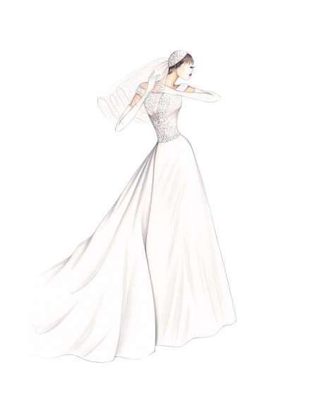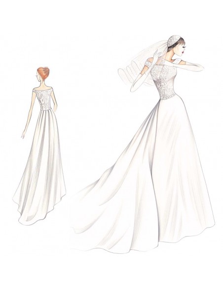 Corsage moulant largement décolleté réalisable en dentelle Chantilly ou Alençon pour la robe qui s'ouvre au bas et la riche traine à plis soulevée. Conseillée en taffetas ou ratzmir.