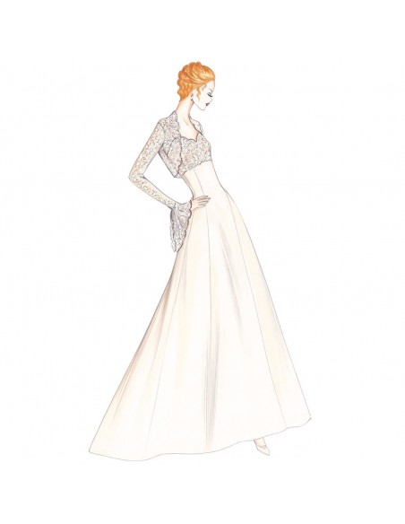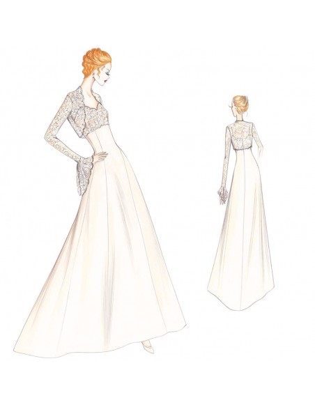 Bustier décolleté avec petites bretelles et enrichi de dentelle Chantilly ou Alençcon. Robe de ligne redingote divisée en pans avec traine réalisable en organdi ou satin Duchesse. Evanescent tulle pour le boléro avec arrondi souligné par des festons en dentelle, importantes manches et poignets à volants avec pointes allongées.