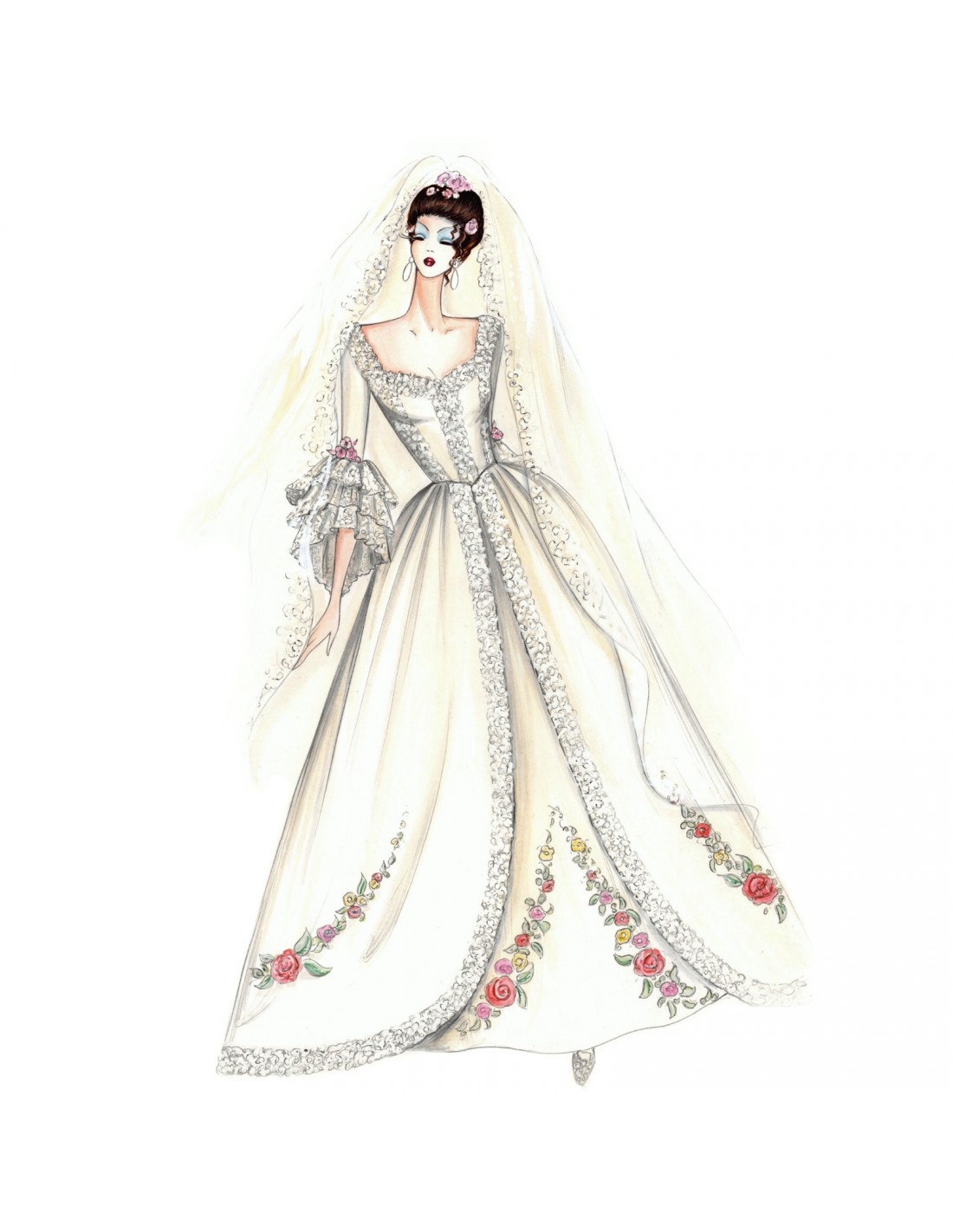 Style néo-baroque pour cette robe en shantung ornée de dentelle. Les manches à triple poignet à volants et la jupe ample à deux couches sont embellies de guirlandes brodées et de fleurs en relief.