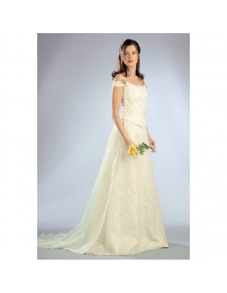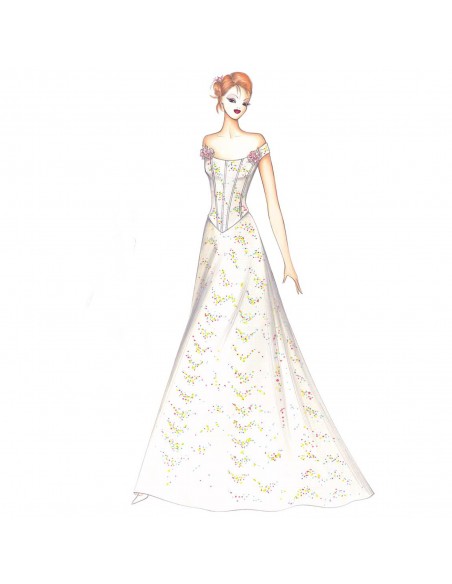 Romantique et estivale la robe 2 pièces réalisable en lin brodé, taffetas ou gazar avec bustier fermé par des lacets dans le dos, encolure arrondie avec fleurs appliquées et coupes obliques qui convergent vers le bas en pointe, l’ample jupe évasée s’ouvre en traine dans le dos.