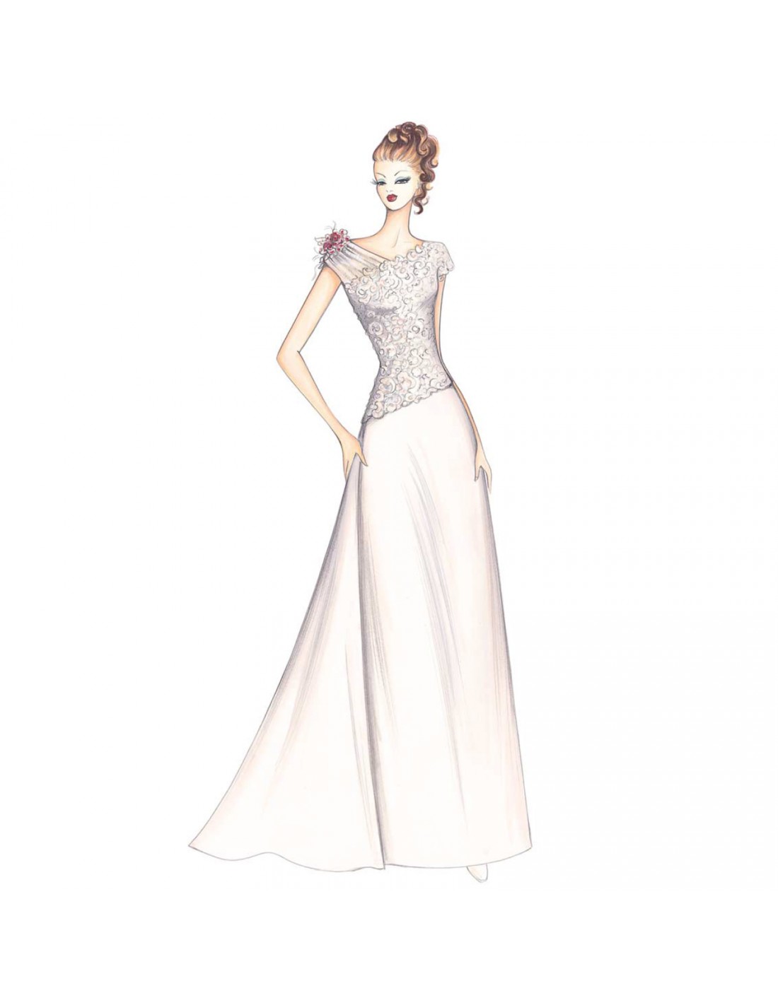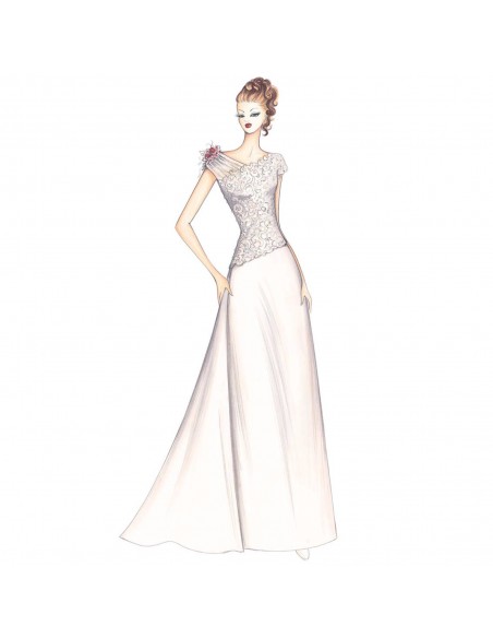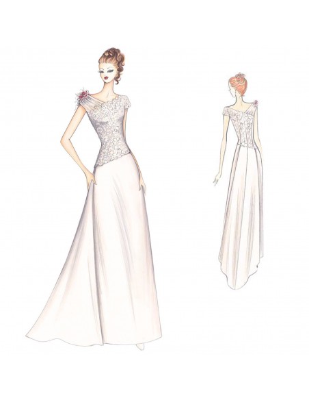 De la dentelle Alençon rend précieux le corsage asymétrique avec encolure et bas en diagonale, manches kimono, raccord en tulle froncé et fixé sur l’épaule par des fleurs; la jupe semi-droite d’une seule pièce avec le panneau est réalisable en mikado, organdi triple ou satin Duchesse.