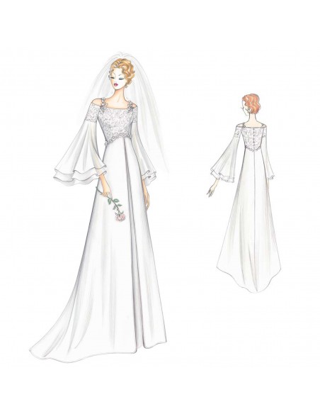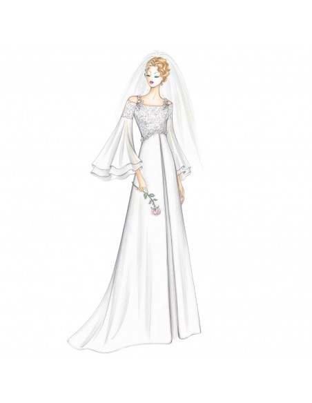 D'importantes manches à larges volants doubles en mousseline de soie ou georgette enrichissent la robe avec corsage en dentelle et coupe empire arquée, soulignés de décors floréaux comme les bretelles, jupe à 2 couches ouverte au milieu avec traine à réaliser du même tissu que les manches.