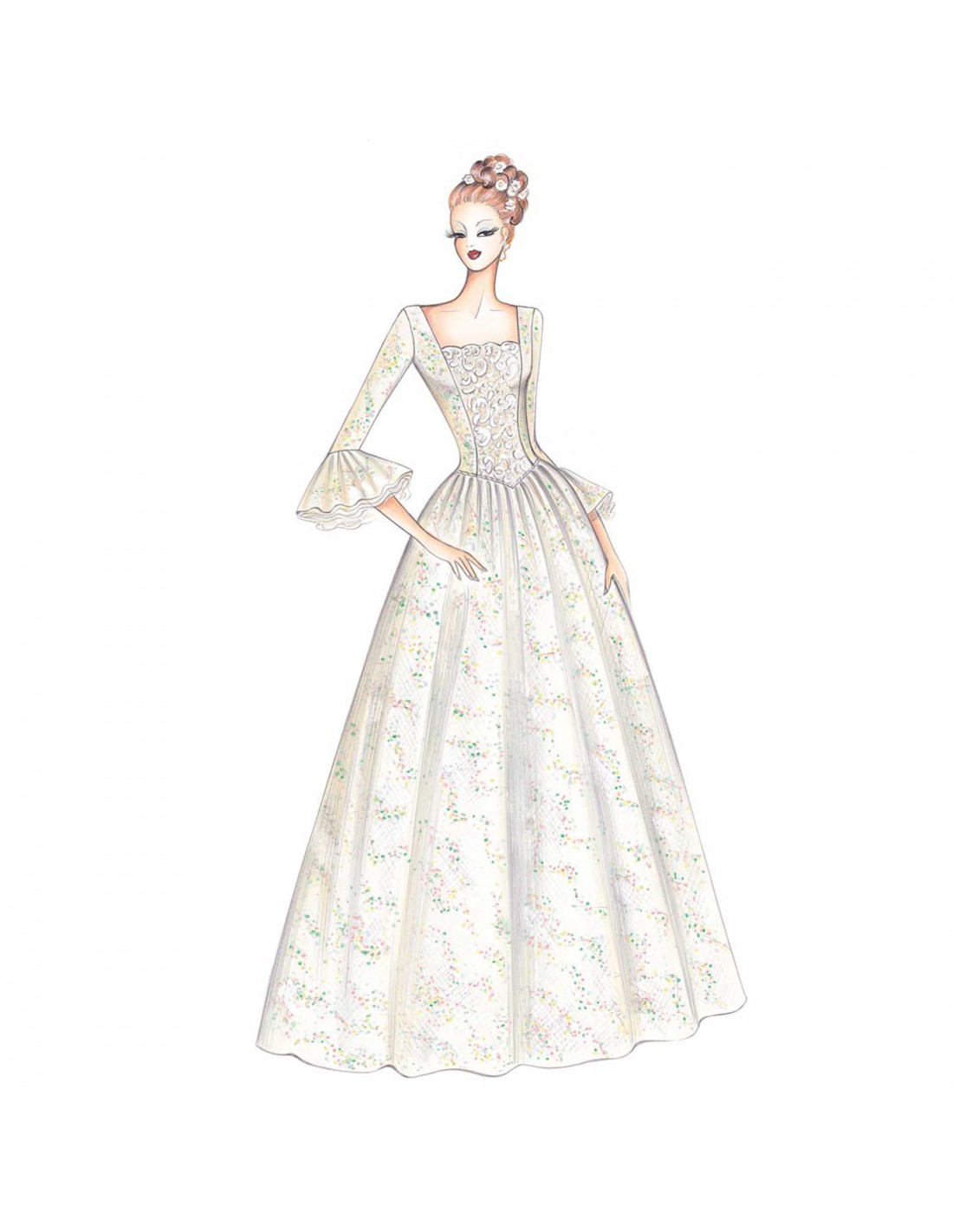 Robe d'inspiration 1700 fermée par des lacets dans le dos avec plastron en dentelle, manches 3/4 avec poignets à volant froncés et jupe ample. Réalisable en lin, tulle brodé ou taffetas.