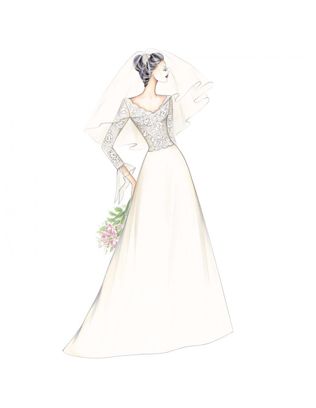 Raffinée robe réalisable en dentelle et mikado, corsage décolleté en V, manche 3/4 avec poignet à volant qui descend en pointe et jupe évasée avec traine.