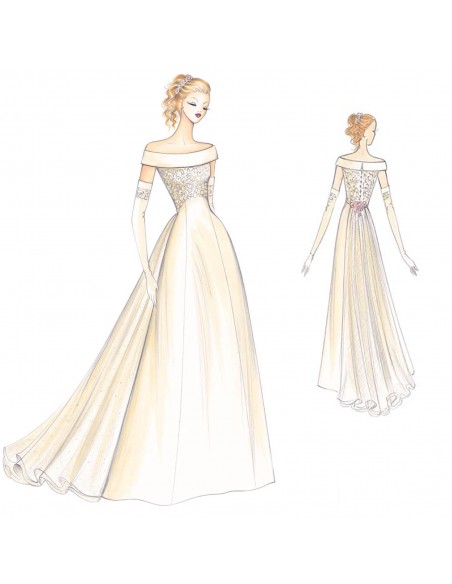 Délicat raccord de dentelle pour la raffinée robe réalisable en gazar ou satin Duchesse, col châlé qui encadre les épaules et jupe évasée enrichie dans le dos par une traine en tulle de plusieurs couches froncée à la taille. Aussi réalisable entièrement en organdi.