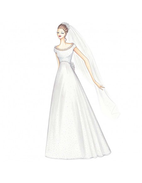 Frais tulle plumetis pour la robe qui découvre les épaules et les encadre avec des doubles ruches, la coupe empire arquée descend dans le dos soulignée par des fleurs et la jupe linéaire s'ouvre vers le bas avec traine.