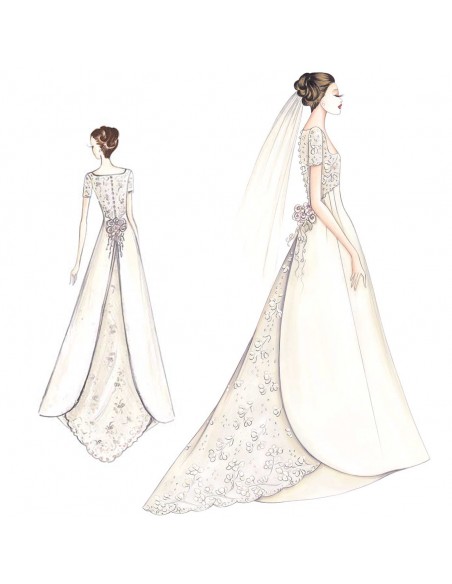 Romantique et élégante la robe au large décolleté arrondi, manches courtes et coupe empire arquée qui descend en V dans le dos, avec ample jupe à 3 couches croisées qui, essentielle sur le devant, s'ouvre sur un arrondi dans le dos et laisse entrevoir la traine. Conseillée en mikado ou gazar et denelle Alençon.