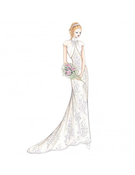 Précieuse dentelle Chantilly ou tulle brodé pour la robe-combinaison qui s'ouvre au bas sur une longue traine en sirène, complétée par un boléro en mousseline de soie avec col-officier qui retient un souple drapé et ouverture arrondie au milieu.