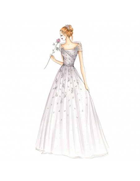 Evanescente robe à réaliser entièrement en tulle brodé ou mousseline de soie avec incrustations, corsage drapé, col en étole et ample jupe à godet froncée à la taille.