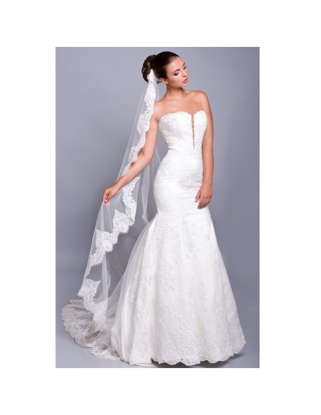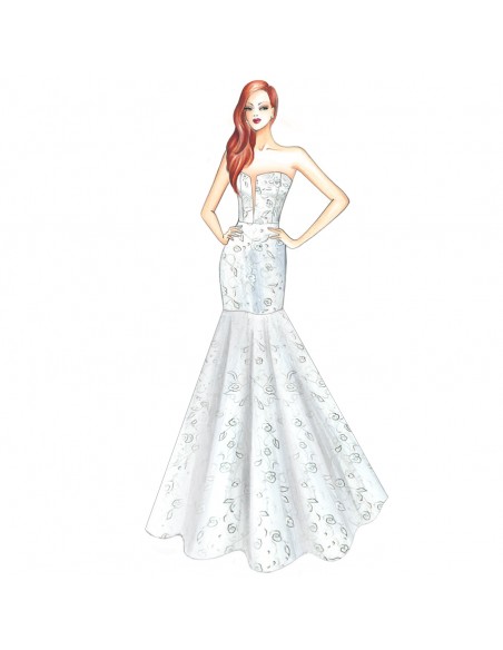 Une ligne sirène pour la robe de mariée entièrement en dentelle ou en mikado brodé, un corsage bustier avec une ouverture centrale en V maintenue par du tulle nude et une jupe droite avec un haut volant qui s'ouvre dans le bas.