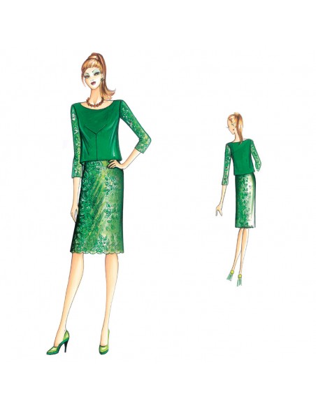 Courte casaque d’inspiration années ’60 à réaliser en crêpe et manches en dentelle comme la jupe légèrement évasée.