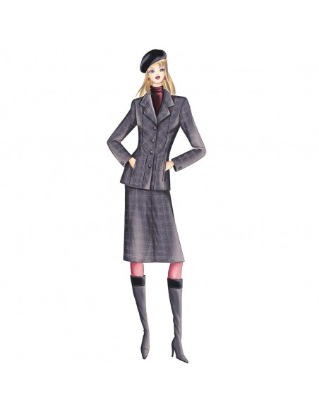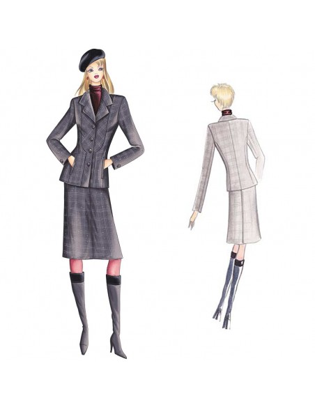 Ensemble avec jupe à 4 pans évasés et veste droite années ’70 de ligne moulée avec fermeture haute, poches lisérées et coupes arrondies qui divisent la veste et permettent de créer des jeux de raies. Réalisable en tartan léger, Prince de Galles, cuir ou daim.