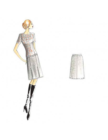 This outfit has a short-sleeved, tight-fitting blouse to be worn under the jacket and a skirt made of panels that are rounded at the bottom and have slits at the front. Jacket n. 1025.