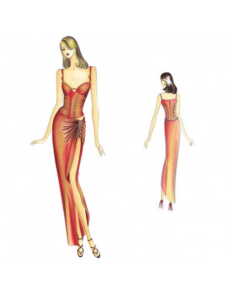 Elégant et sexy le bustier réalisable en taffetas ou satinette avec bonnets séparés par un anneau et raccords drapés sur les côtés. Jupe n. 9503.