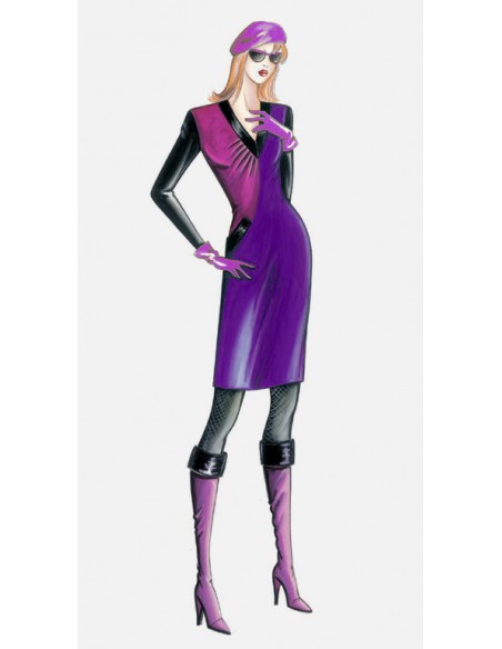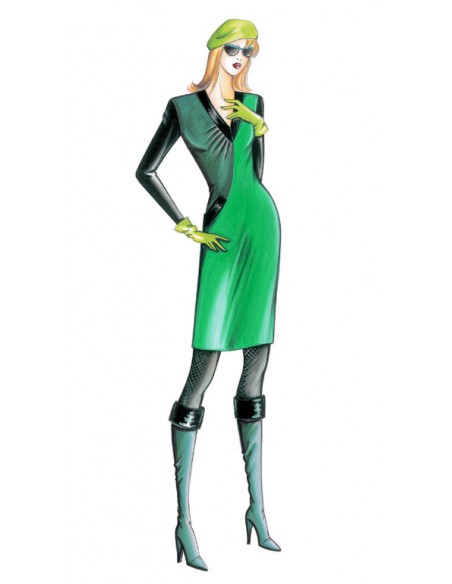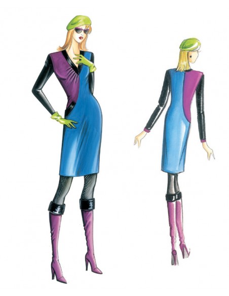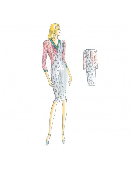 Fourreau conseillé en double jersey ou crêpe de laine de plusieurs couleurs, col en V avec un côté drapé et poche sur le côté.