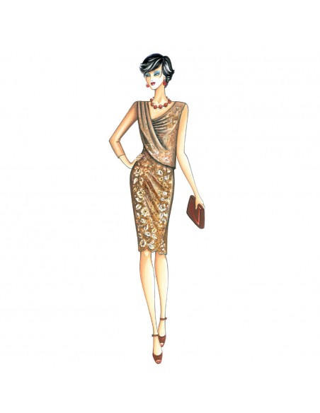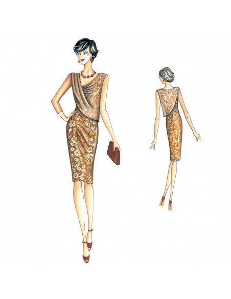 Robe fourreau moulée et jeux de drapés croisés sur le court pan asymétrique inséré dans la couture. Conseillée en crêpe, jersey de viscose ou dentelle et boléro en chiffon.