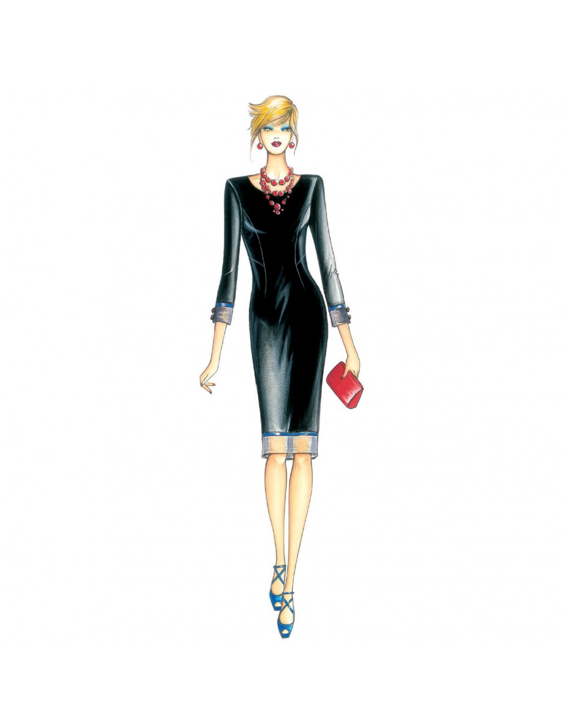 Ensemble formé d’une robe fourreau en crêpe avec poignets et col en organdi ou double chiffon ou tout en dentelle et d’un chauffe-épaules à foulard qui descend en pointe sur le devant et dans le dos, à réaliser en organdi léger ou chiffon.