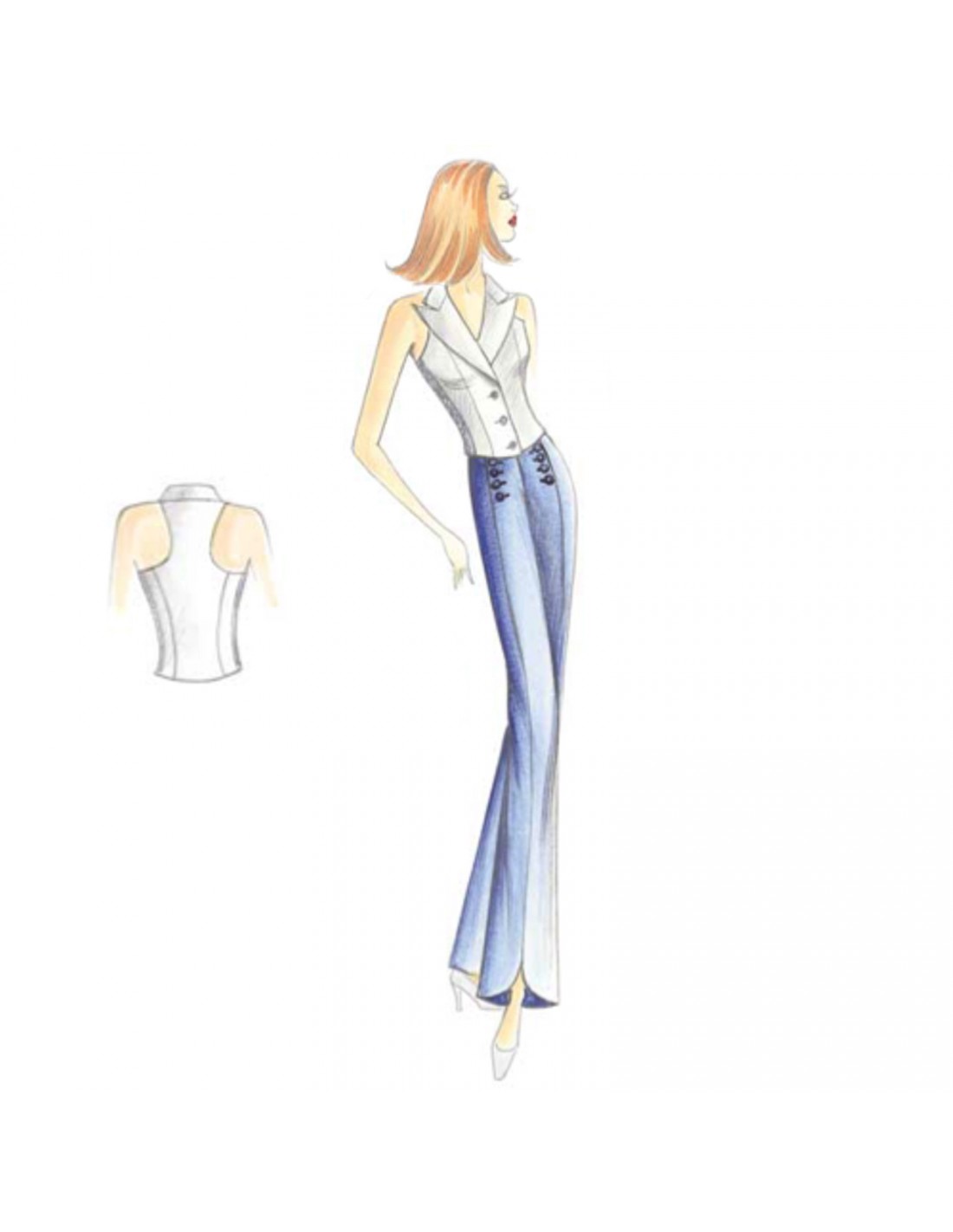 Gilet avec emmanchure creuse, col à revers en pointe et bordures bleues appliquées sur le tissu de lin ou gabardine de coton.