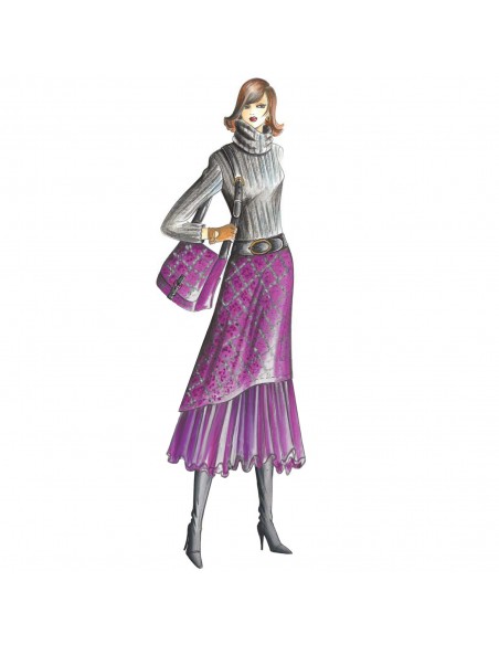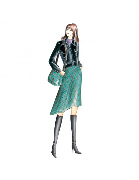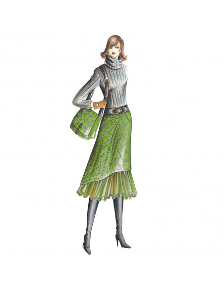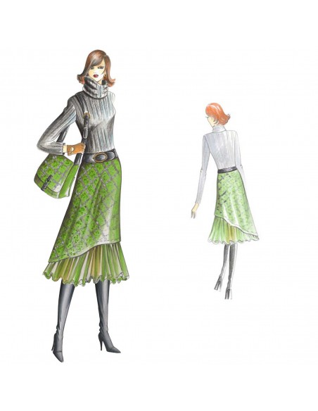 Jupe évasée réalisable en velours, tweed ou écossais en biais avec coupe en diagonale au bas dans laquelle s’insère un volant froncé en mousseline de soie de deux couches.