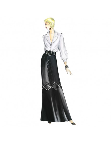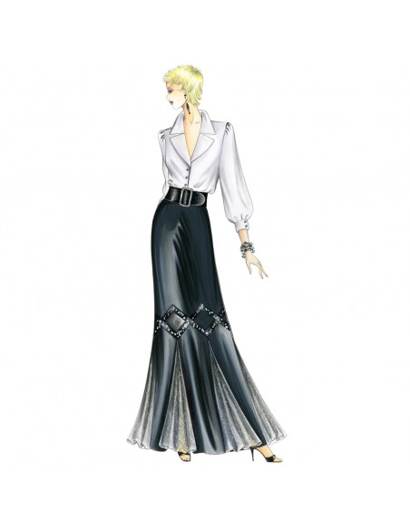 Cette jupe évasée, recommandée en crêpe ou en satin, peut être réalisée en trois versions : simple, avec des bordures rebrodées appliquées en forme de losange, avec de grands panneaux insérés au bas de la jupe en mousseline, en tulle ou en dentelle. Blouse n. 7094.