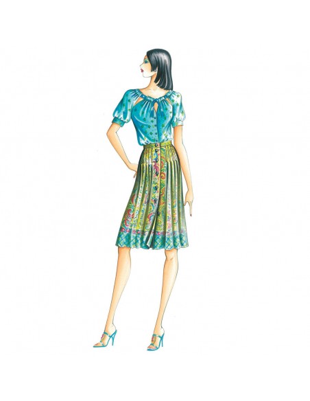 Jupe conseillée en mousseline ou maille de coton, plis cousus sur les hanches et laissés libres vers le bas, fermeture au milieu avec des boutons. Blouse n. 2223.
