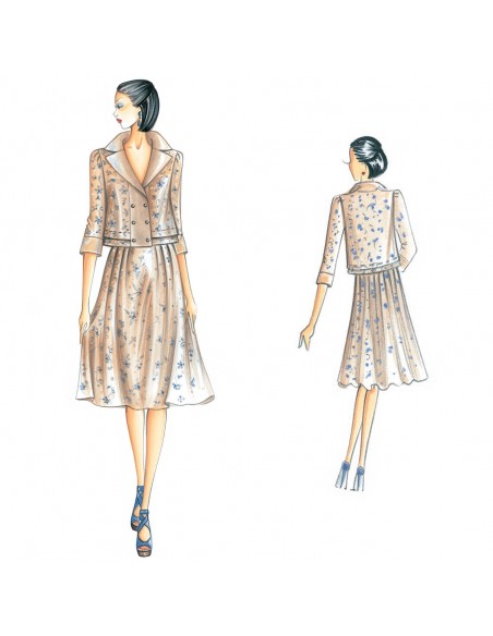 Ample jupe cloche avec plis non repassés, à réaliser également en version midi avec bordure en organdi ou tulle de soie. Veste n. 3044.